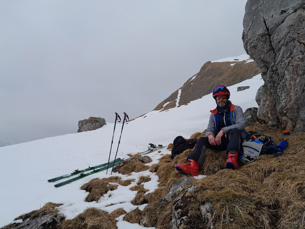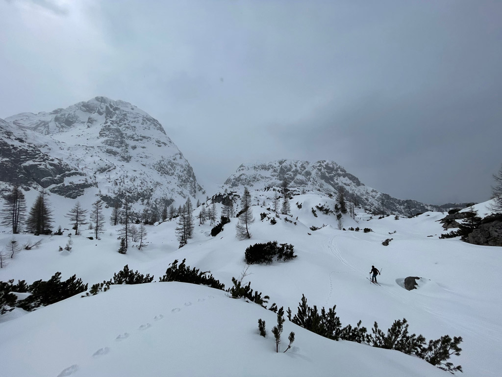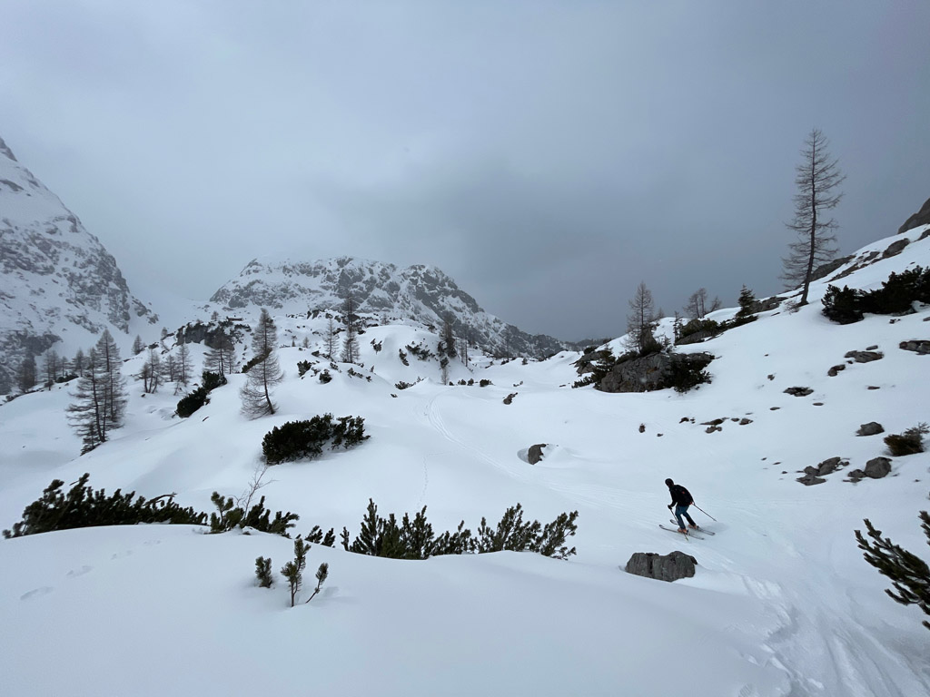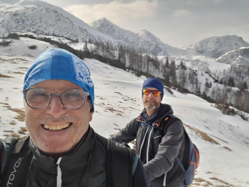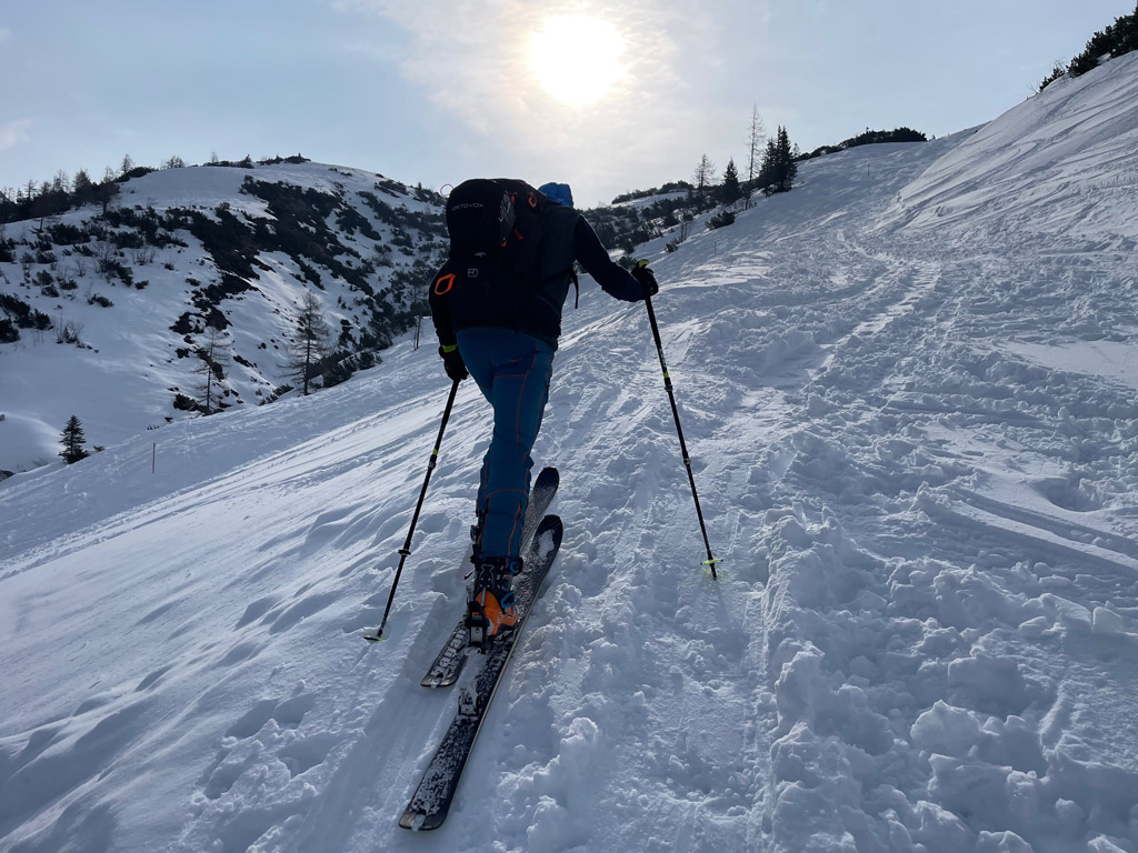 Programmgemäß ging's am 21.03.2026 auf eine Fortgeschrittenen-Skitour zur Kleinen Reibn. Startpunkt war der Parkplatz Hinterbrand. Ab der Jenner Mittelstation lag genug Schnee, um auf die Ski zu wechseln. Abwechslungsreich präsentierte sich der Aufstieg zum Stahlhaus. Von dort ging es auf griffigem Schnee hoch zum Schneibstein (2276 m). Die Abfahrt, nördlich am Windschartenkopf vorbei, gestaltete sich wegen der unterschiedlichen Schneeverhältnisse technisch interessant. Besonders beeindruckend war die einsame, winterliche Gebirgslandschaft zwischen Hochseeleinkopf und Fagstein. Nach der obligaten Pause am Brotzeitfelsen querten wir zu den Rossfeldern bis auf 1975 m. Die Abfahrt zu den Priesbergalmen gelang problemlos, teilweise war sogar Pulverschnee geboten. Ab der Enzianbrennerei mussten die Ski dann wieder geschultert und über den Königsweg zurück getragen werden. Eine wunderbare und abwechslungsreiche Tour, zurecht ein Klassiker der Berchtesgadener Alpen!