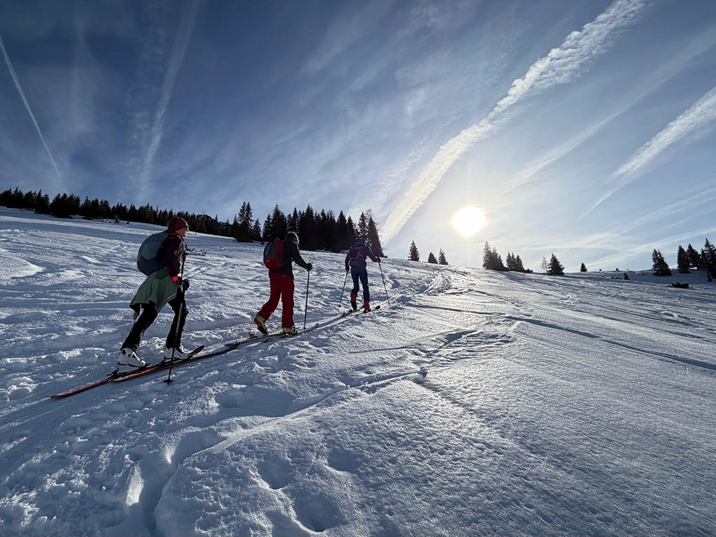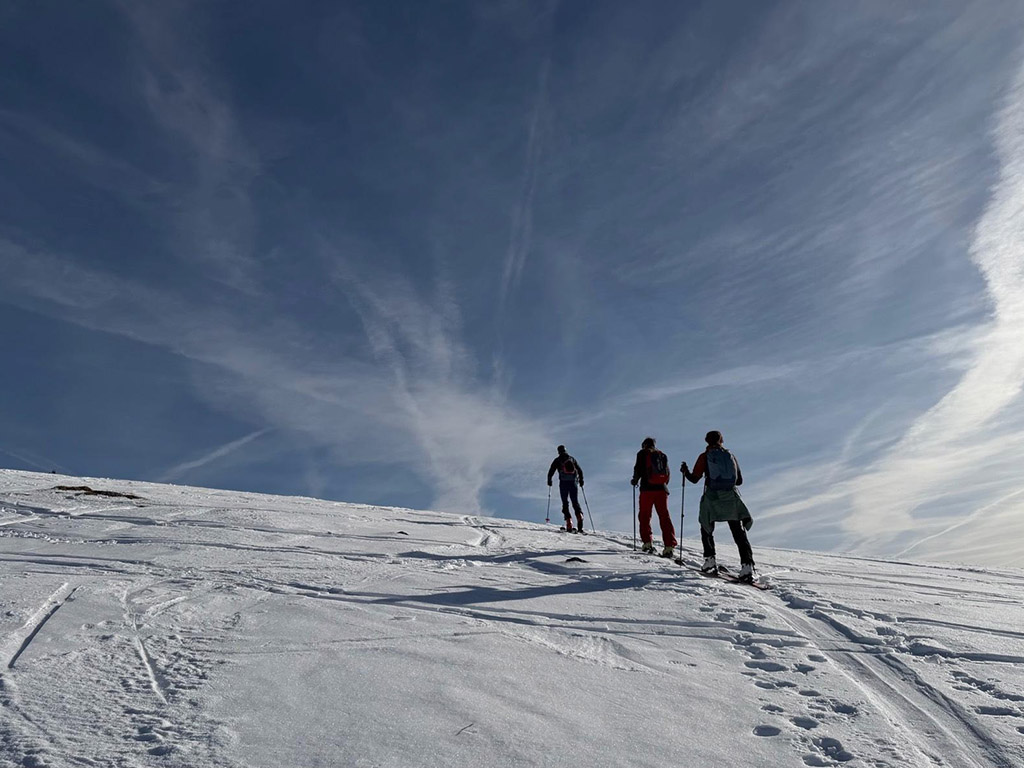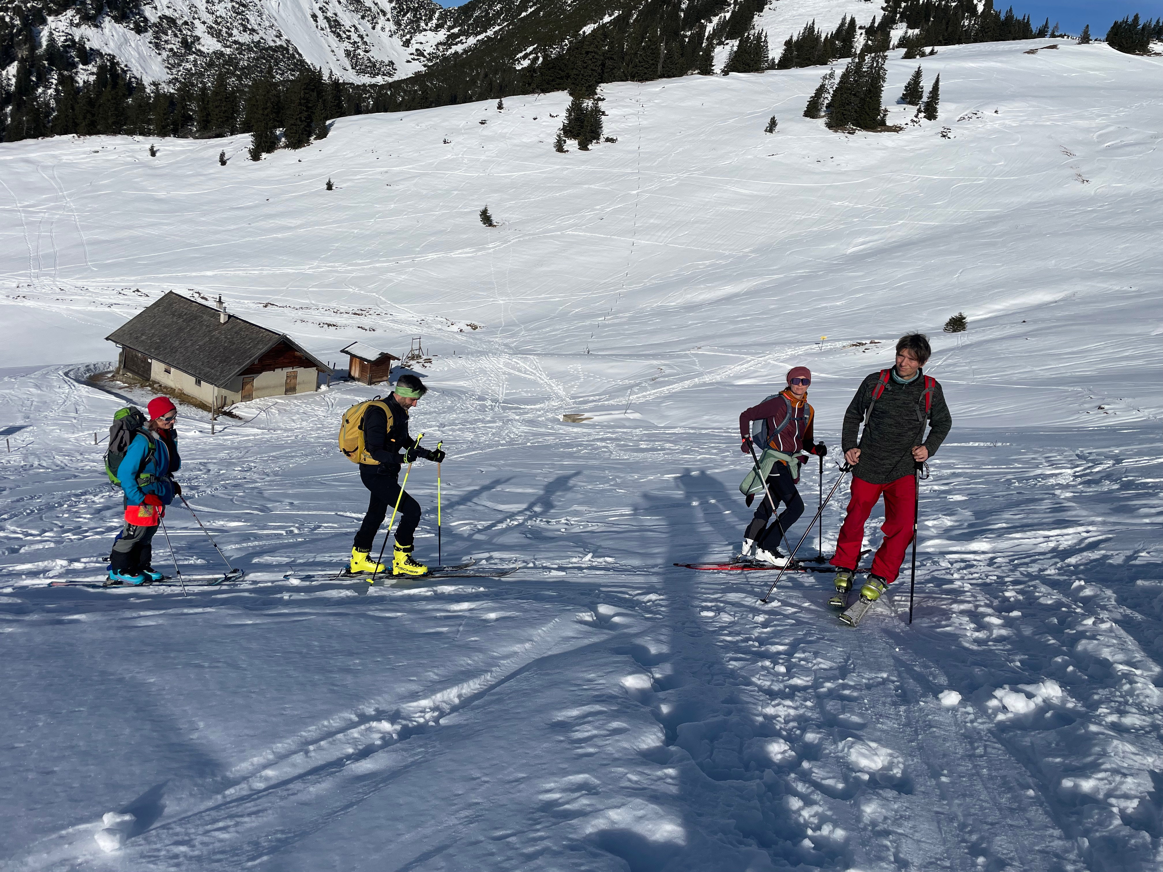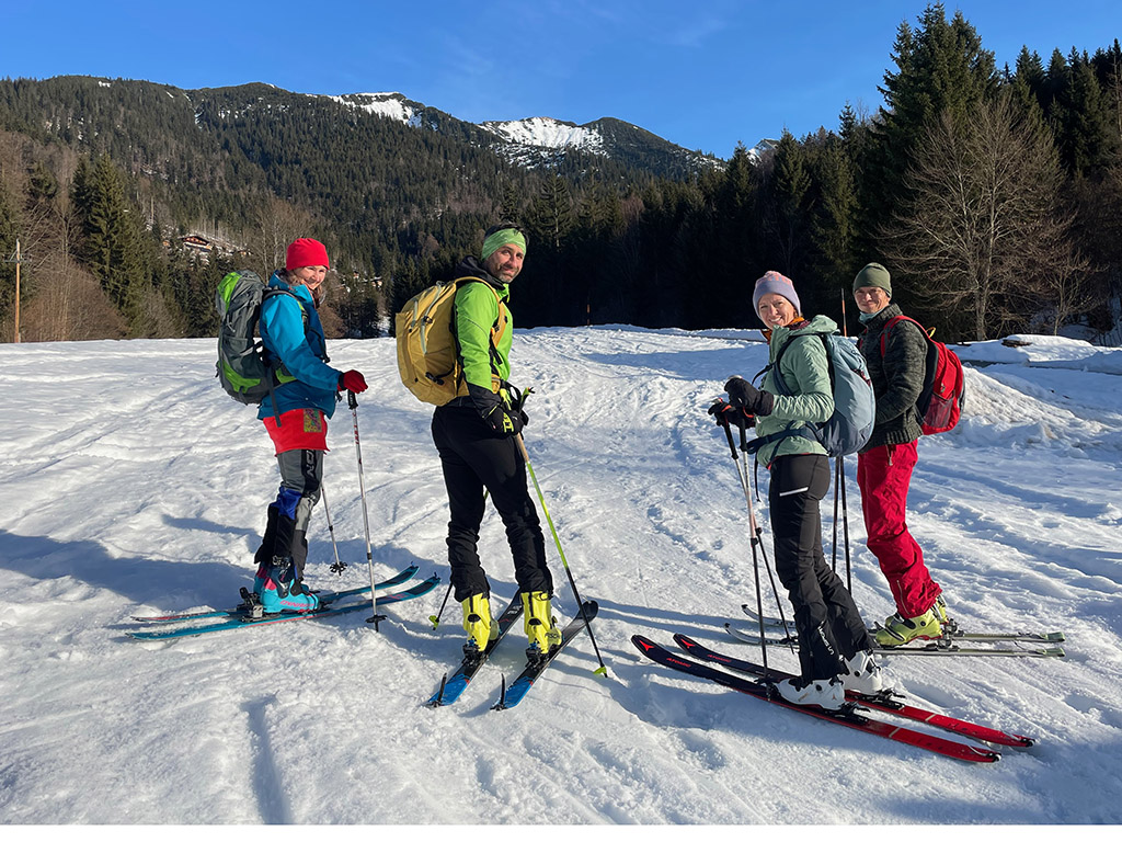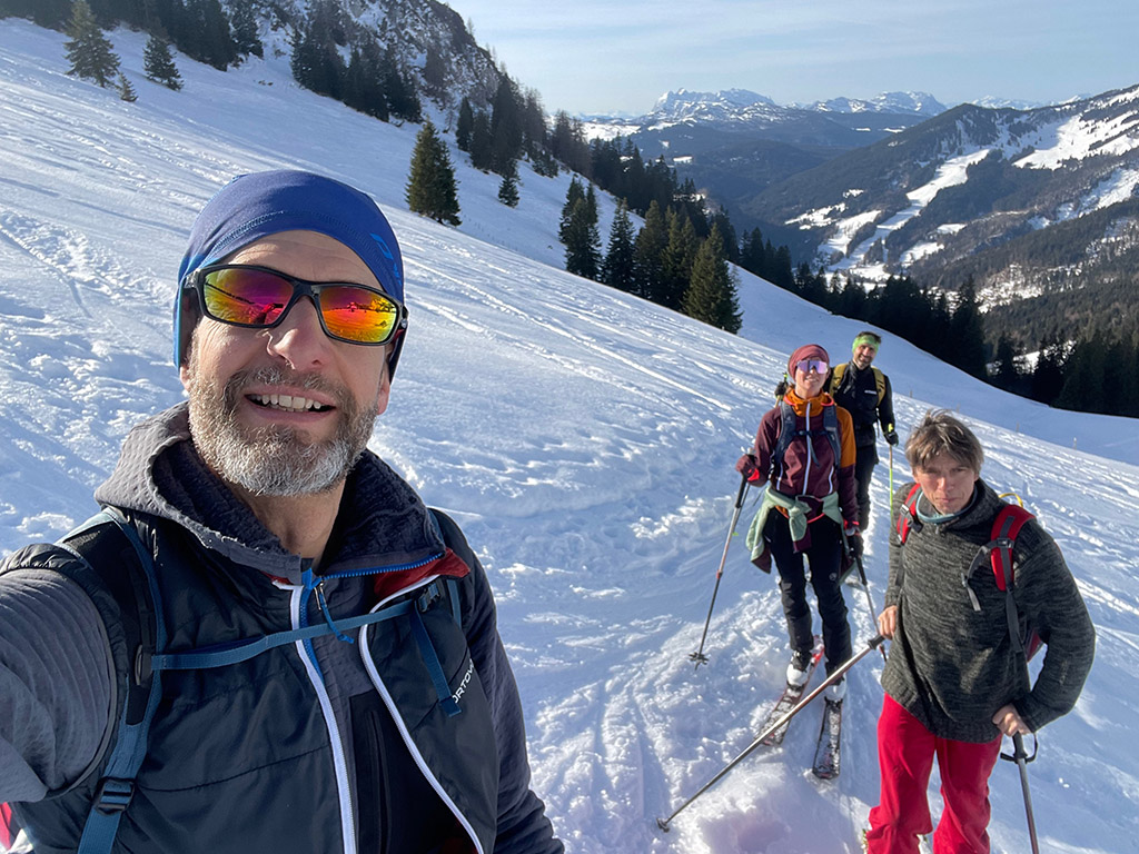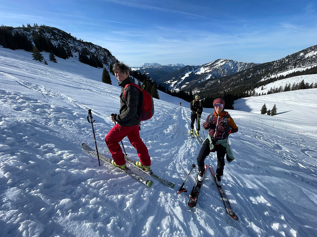 Am Samstag 14.01. lockte uns das stabile Winterwetter auf eine erste, leichte Skitour ins Heutal. Bei bester Aufstiegstemperatur um Null Grad ging es vom Parkplatz im Angerertal mit kapper Schneebedeckung durch den Wald und dann auf der Forststraße bis zum Abzweig vom Weg Richtung Hochalm. Der Blick weitete sich herrlich im Aufstieg über die sanften Hänge bis hin zum Gipfel. Bei Windstille und großartigem Rundumblick konnten wir die Brotzeit direkt am Gipfelkreuz entspannt genießen. Die Abfahrt war dann, auf harschigem, zuletzt am Reichenhaller Hang auch sehr spärlichem Schnee, der anspruchsvollste Teil dieser schönen Tour.